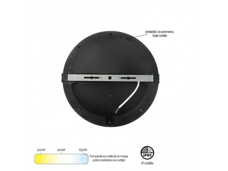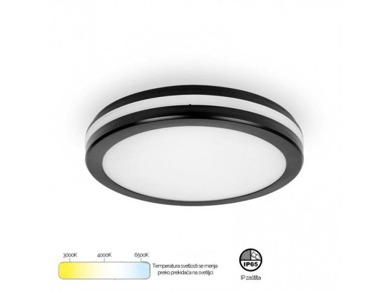 LED plafonska svetiljka u crnoj boji, snage 20 W sa mogućnošću izbora boje svetla putem prekidača. Osim što je pogodna za korišćenje kao unutrašnja rasveta (u hodnicima, dnevnim sobama, trpezarijama, poslovnom prostoru), ova lampa zahvaljujući visokoj IP65 i IK08 zaštiti može se koristiti i u težim uslovima, na mestima koji se izloženi vlagi, vodi, prašini (kupatila, perionice, garaže, podrumi).