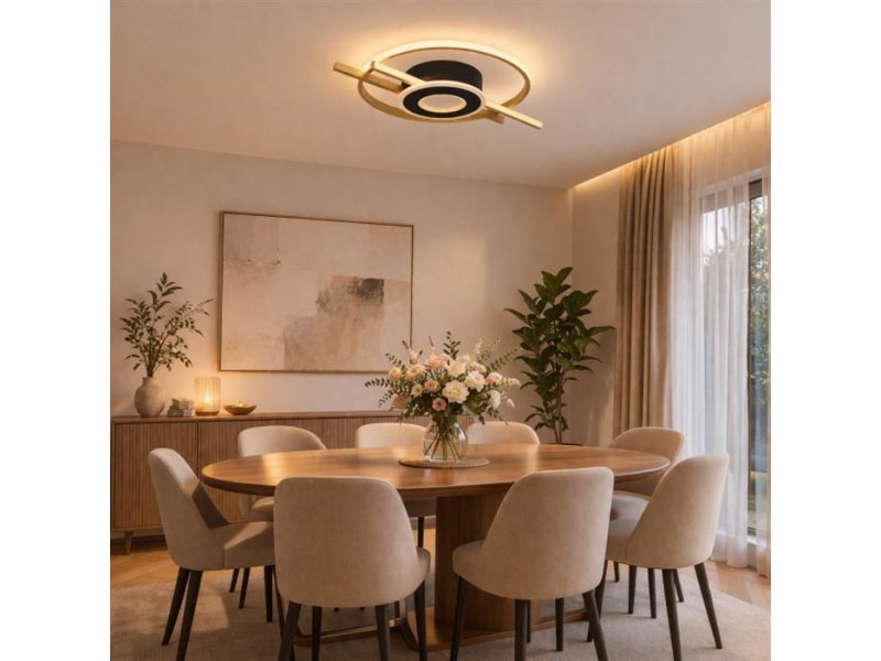 Kombinacija crne i zlatne daje luksuzan i sofisticiran karakter prostoru, dok kružni oblik doprinosi modernoj estetici i ravnomernoj distribuciji svetlosti. Ovaj model je idealan za dnevne boravke, spavaće sobe, restorane ili reprezentativne poslovne prostore gde je važan i dizajn i funkcionalnost.
