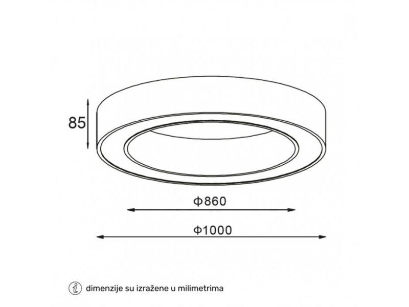 | Specifikacija | Tip proizvoda: LED plafonjera Model: VESTA 681 Nazivni napon: 220-240V AC / 50/60Hz Nazivna snaga: 80 W Temperatura boje svetlosti: 3000K ili 4000K (opciono) Izvor svetlosti: LED Boja proizvoda: Bela Materijal: Aluminijum/PC Dimenzije: Ø 1000 mm; h- 85 mm Način montaže: Nadgradna Temperatura okruženja: -15°C do +45°C Prosečan radni vek: 30 000 h na 25° C Energetska efikasnost: A++ Stepen električne zaštite: Klasa I Potrošnja električne energije: 80 kWh / 1000h |
