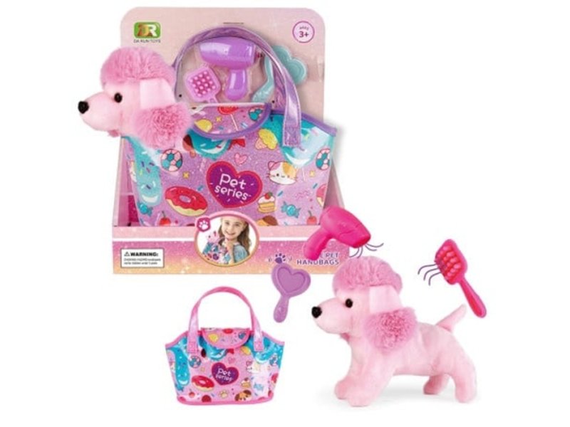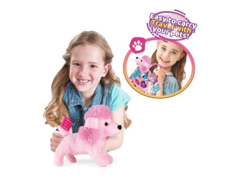 Roze plišana kuca sa ljubičastom torbicom i dodacima za igru! Sve što je potrebno za brigu o tvom kućnom ljubimcu!