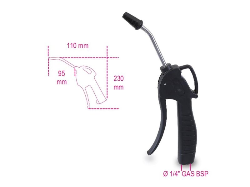 | Karakteristike | Ulaz za vazduh (GAS): 1/4″ Radni pritisak: 4 - 8 bara Maksimalni pritisak: 12 bara Radna temperatura -20°C / +70°C Dimenzije: 230 x 110 mm Težina: 125 g |