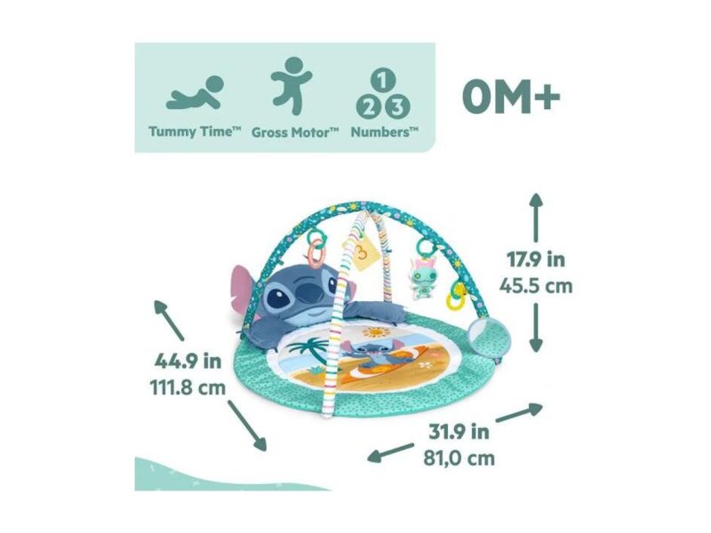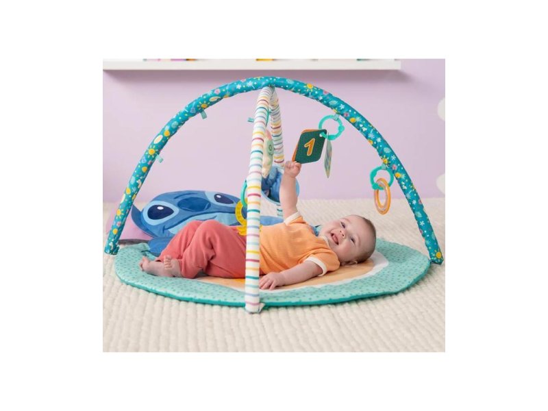 | Karakteristike | Šareni motivi inspirisani Diznijevim junakom Stičom donose atmosferu veselja i avanture. Dizajn pun boja i detalja stimuliše bebine vizuelne sposobnosti i doprinosi stvaranju pozitivnog i podsticajnog okruženja. Podloga za igru je izrađena od materijala prijatnih za kožu i lako se održava – pogodna je za pranje u mašini. Kada se igra završi, luk sa igračkama i jastučence se lako skidaju, a podloga se preklapa radi jednostavnog skladištenja i nošenja. Kompaktna konstrukcija čini je idealnim saputnikom i kod kuće i na putovanjima. Set sadrži pet pažljivo osmišljenih igračaka koje stimulišu čula i podstiču radoznalost. Ogledalce pomaže bebi da upoznaje sopstveni odraz, zvečka i platnena igračka razvijaju sluh, dok silikonski ananas pruža iskustvo istraživanja tekstura ustima. Fleš kartice sa brojevima podstiču rano učenje kroz zabavu, dok se sve igračke mogu koristiti i odvojeno, što dodatno produžava njihovu upotrebu.