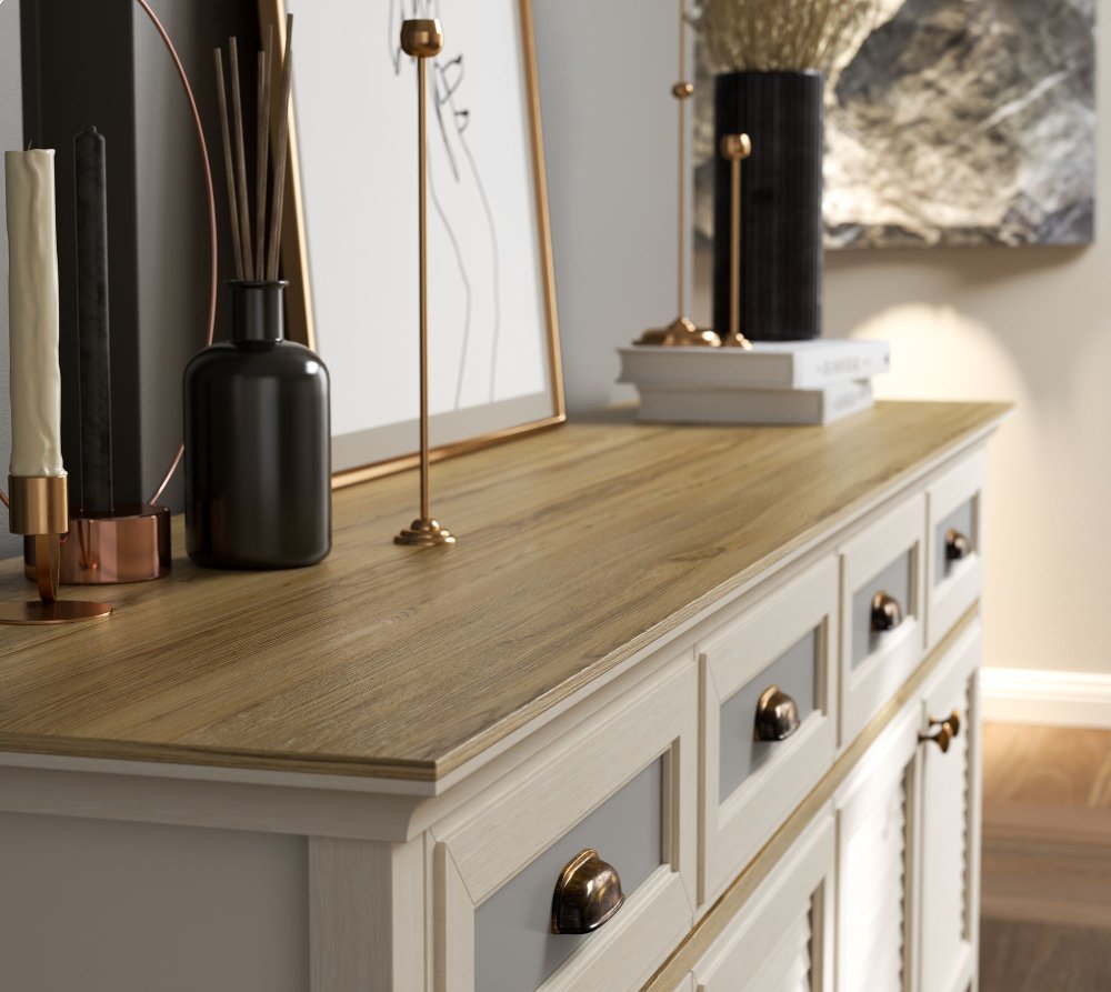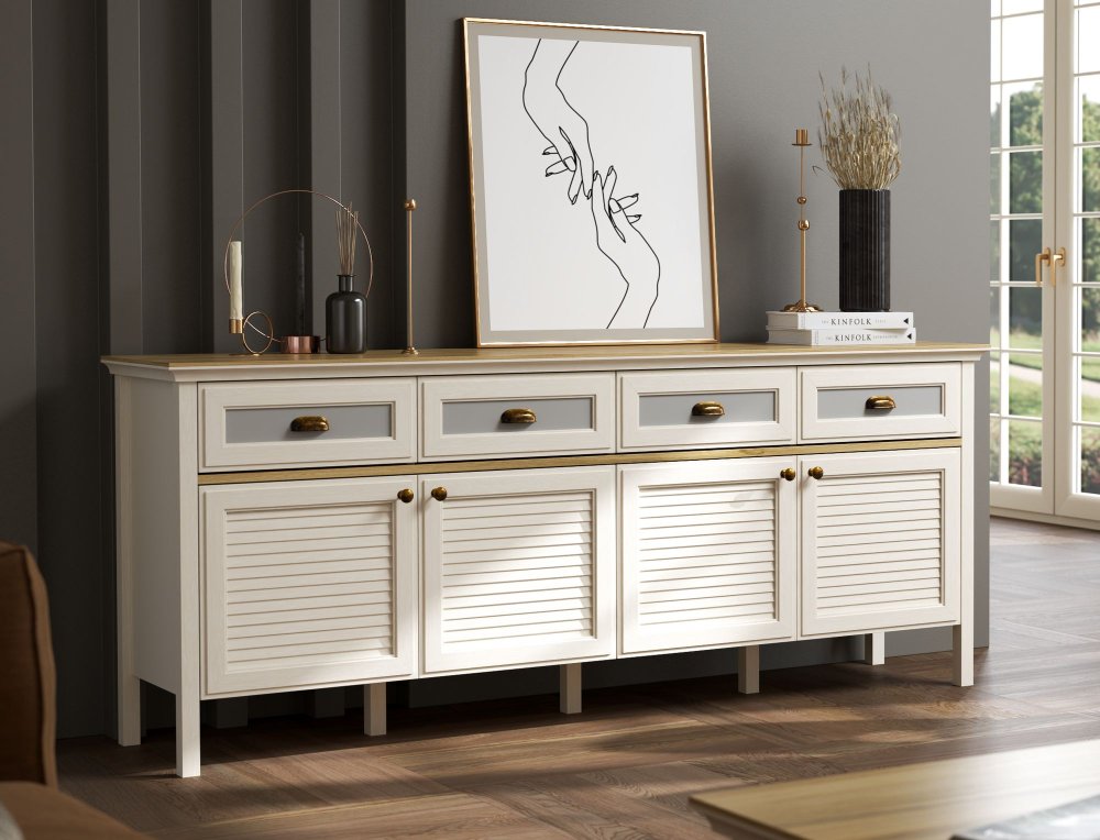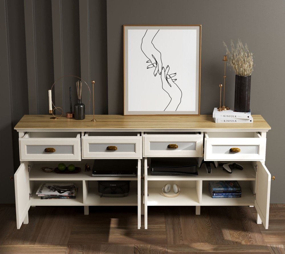 | Specifikacija | Komoda Materijal: 100% Iverica presvučena melaminom Debljina iverice: 18 mm Materijal vrata: 100% Medijapan Materijal nogara: Medijapan Materijal ručke: Metal Ivična traka: 0.8 mm Dimenzije: Širina: 200.4 cm Visina: 82.1 cm Dubina: 44.2 cm Visina nogara: 15 cm Dodatne funkcionalnosti: Više polica, mogućnost fiksiranja za zid |
