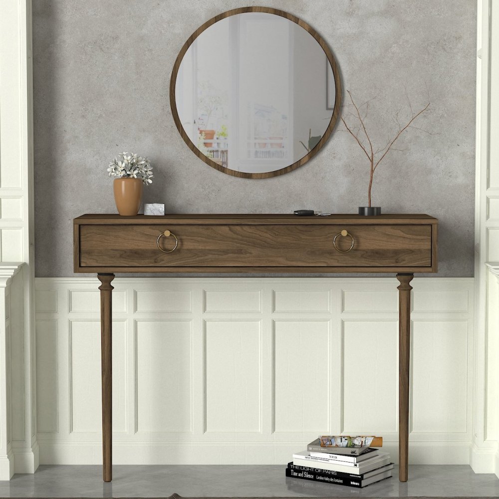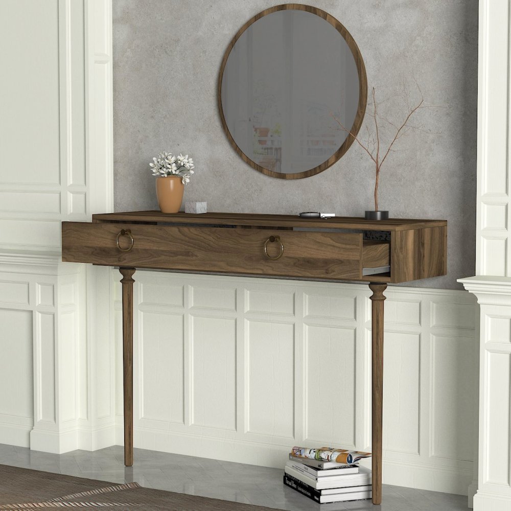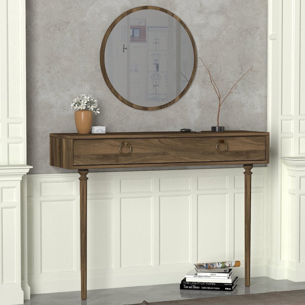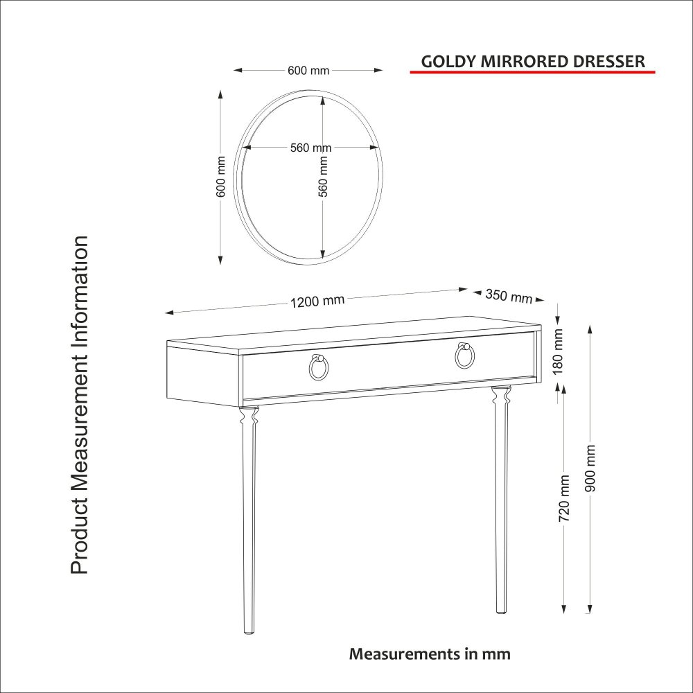 Specifikacija | Komoda sa ogledalom Materijal: 100% Iverica presvučena melaminom Debljina iverice: 18 mm Materijal nogara: Drvo (bukva) Dimenzije: Širina: 120 cm Visina: 90 cm Dubina: 35 cm Visina fioke: 18 cm Dimenzije ogledala: Širina: 60 cm Visina: 60 cm Dubina: 2 cm Broj fioka: 1 Može se pričvrstiti za zid Dodatni prostor za odlaganje |