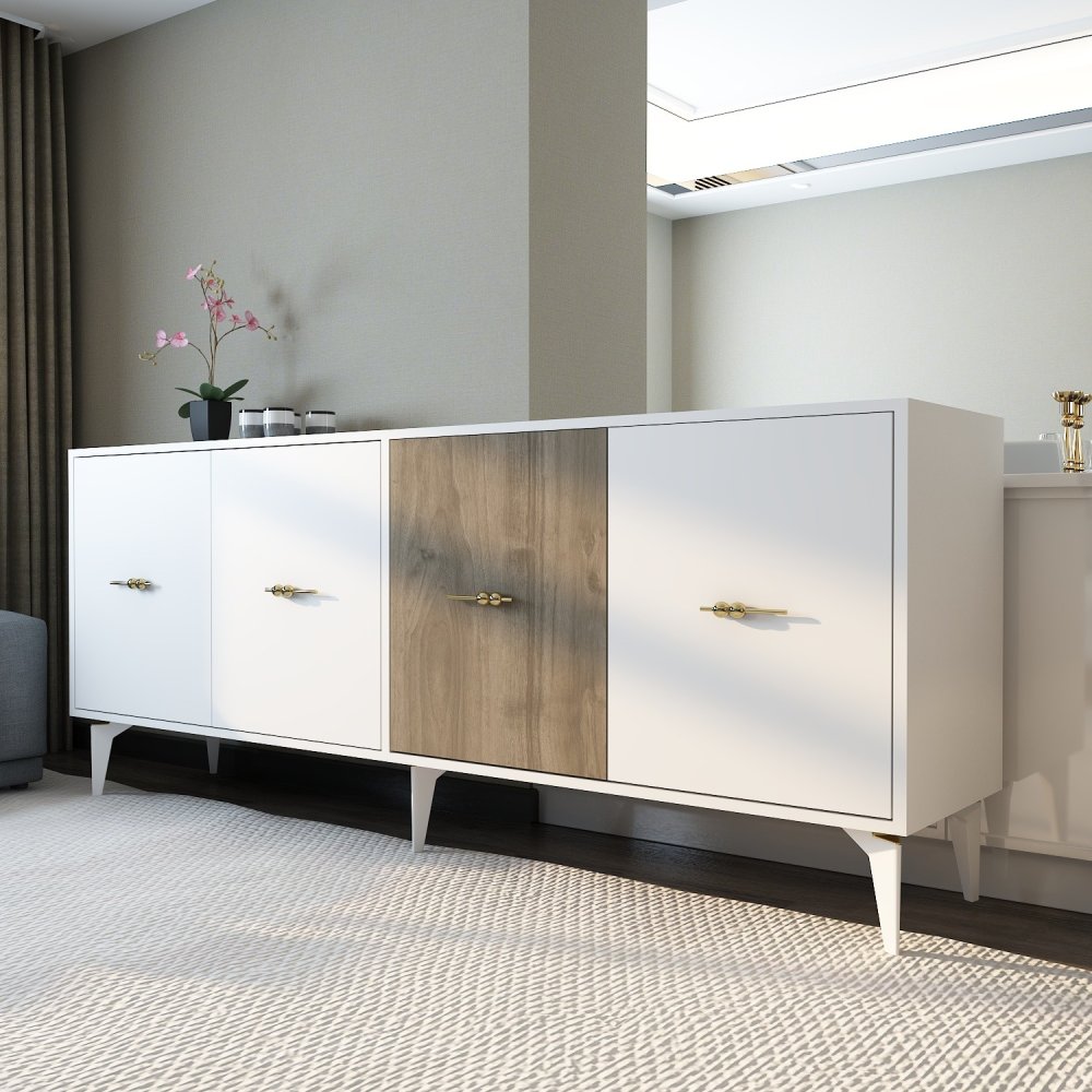 Specifikacija | Komoda Materijal: 100% Iverica presvučena melaminom Debljina iverice: 18 mm Dimenzije: Širina: 180 cm Visina: 82.6 cm Dubina: 35 cm Visina police: 29.1 cm Visina nogara: 15 cm Dodatne funkcionalnosti: Više polica, mogućnost fiksiranja za zid |