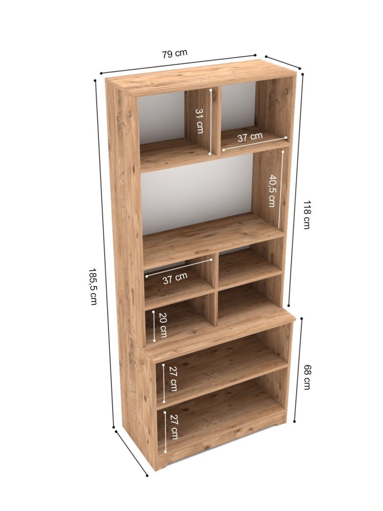 | Specifikacija | Višenamenska Atlantic Pine Bela polica Lunora 100% Melaminska obloga iverica Debljina: 18 mm Širina: 78 cm Visina: 185 cm Dubina: 42 cm Visina nogare: 15 cm Brojne police Može se pričvrstiti na zid |