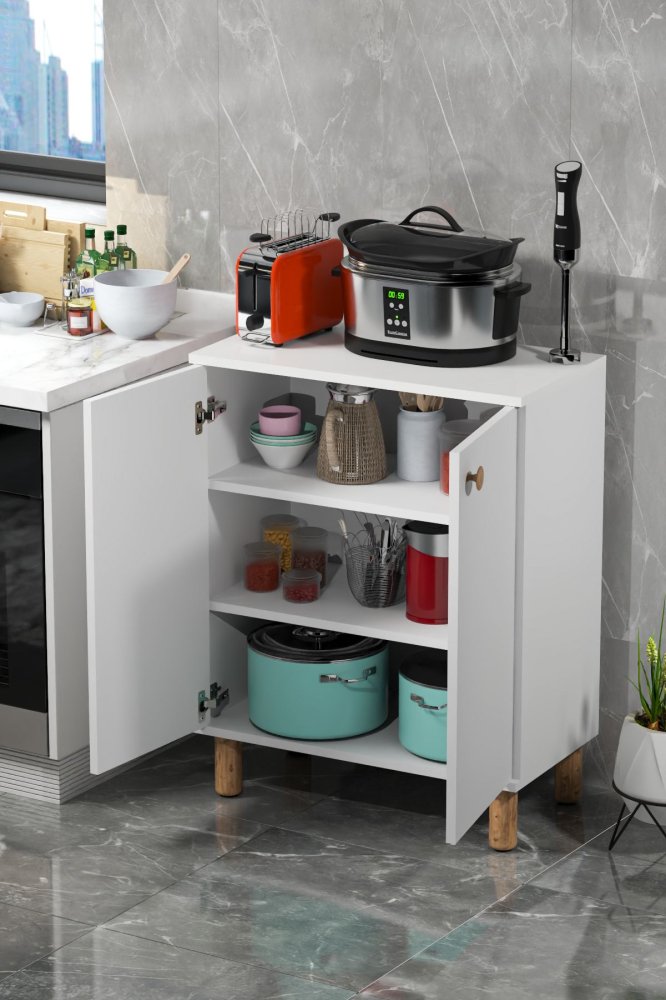 | Specifikacija | Višenamenska samostojeća komoda Atlantic Pine Bela Toriva W 100% Melaminska obloga iverica Debljina: 18 mm Širina: 70 cm Visina: 91 cm Dubina: 35 cm Visina nogare: 15 cm Brojne police Može se pričvrstiti na zid |
