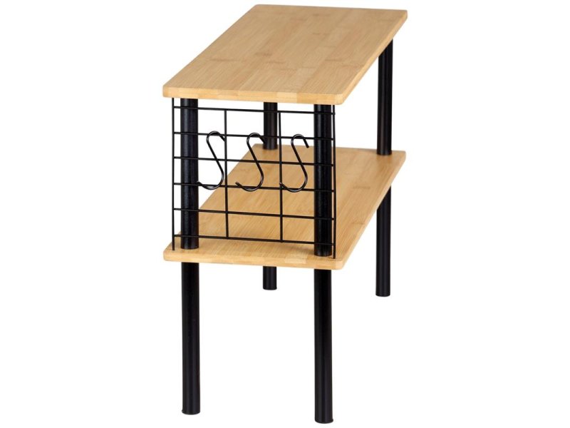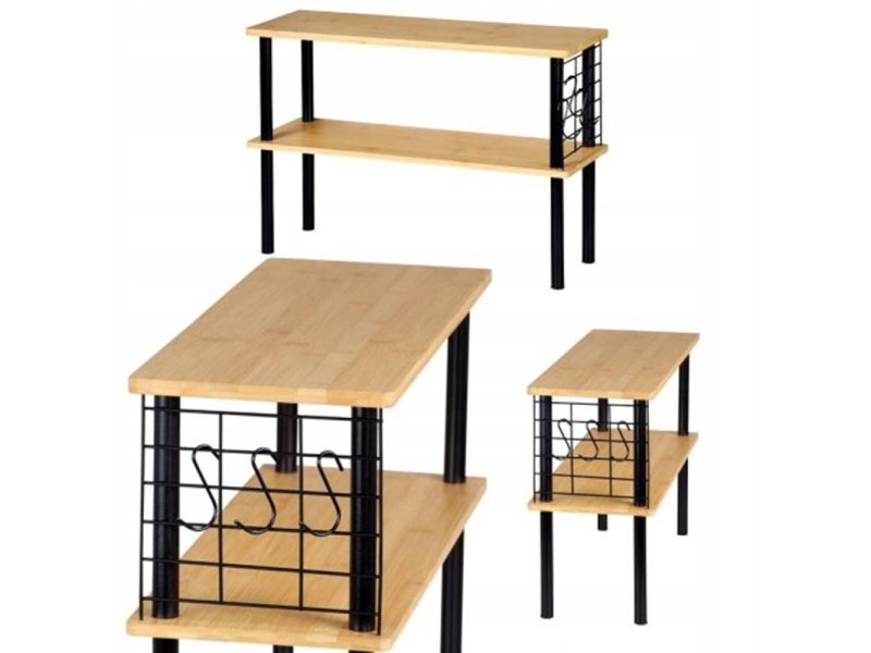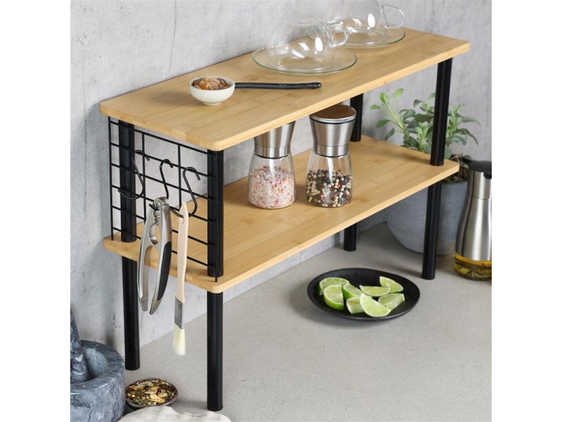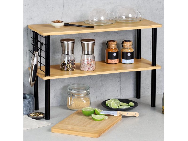| Specifikacija | Materijal: Bambus (FSC) Nosivost po polici: 5 kg Širina: 55 cm Dubina: 20 cm Visina: 38 cm Težina: 2.5 kg Boja: Braon Instrukcije za održavanje: Ručno čišćenje Isporuka: Nemontirano Za kačenje vaših kuhinjskih pomagala ili krpa, sa strane su za vas postavljene tri dodatne mrežaste kuke Pomoć u kuhinji, sve je na dohvat ruke Police su idealne za odlaganje začina, ulja i začinskog bilja Moderan dizajn |
