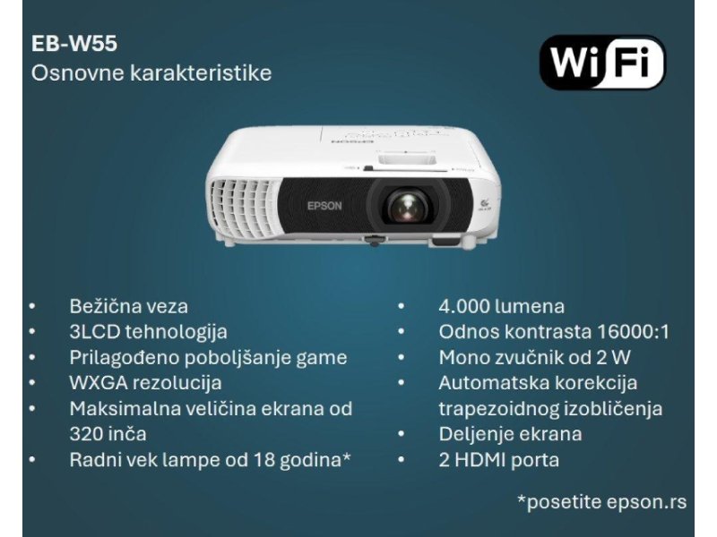 | Karakteristike | Tip: Mobile / prenosivi Sistem projekcije: 3LCD tehnologija, RGB liquid crystal shutter Nativna rezolucija: 1280 x 800 (WXGA) Kontrast: 16.000:1 Vertikalno osvežavanje: 100Hz - 120Hz Paleta boja: 16.77 miliona boja Sočivo: F = 1.49 - 1.72 Veličina slike: 33" - 320" Optimalna udaljenost: 1.68m - 2.02m, na projekcionoj površini od 60" Koeficijent dometa: 1.30 – 1.56:1 Zum: 1 - 1.2 manuelni Odnos stranica slike: 16:10 Tip izvora svetlosti: Lamp |