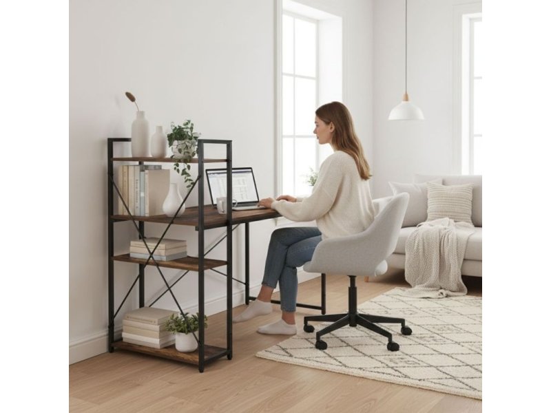 | Karakteristike | Radni sto 120×60 cm sa policama Loft Style ModernHome Radna površina: MDF ploča sa PVC furnirom – izdržljiva i laka za čišćenje Police: 3 police za dodatni prostor za odlaganje Montaža polica: moguće postaviti sa leve ili desne strane Konstrukcija: metalna rama – stabilna i čvrsta Podešavajuće nogice: omogućavaju stabilnost i zaštitu podova Maksimalno opterećenje: do 200 kg Stil: moderan loft dizajn – uklapa se u različite enterijere Pogodan za: kućnu kancelariju, radnu sobu, studentski prostor ili gaming zona |