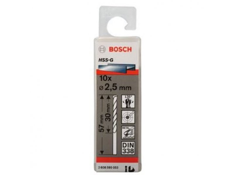 Spiralna burgija od brzoreznog čelika velike snage po normi DIN 338. Spiralna burgija sa desnim sečenjem tip N, vrh burgije 135°, ukršteno brušenje po normi DIN 1412 C, tolerancija prečnika h 8. Prihvat odgovara prečniku burgije, boja burgije: polirana. Sa dve oštrice, cilindrične, dve spirale. Napomena: Kod rada sa burgijama za metal HSS-G koristite univerzalno rezno ulje 2 607 001 409. Za legirani i nelegirani čelik do zetezne čvrstoće od 900 N/mm², čelični liv, sivi liv, sinterovano gvožđe, temper liv, obojene metale, tvrdu plastiku.