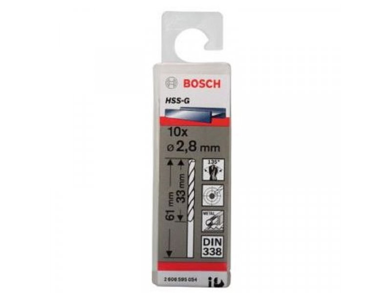 Spiralna burgija od brzoreznog čelika velike snage po normi DIN 338. Spiralna burgija sa desnim sečenjem tip N, vrh burgije 135°, ukršteno brušenje po normi DIN 1412 C, tolerancija prečnika h 8. Prihvat odgovara prečniku burgije, boja burgije: polirana. Sa dve oštrice, cilindrične, dve spirale. Napomena: Kod rada sa burgijama za metal HSS-G koristite univerzalno rezno ulje 2 607 001 409. Za legirani i nelegirani čelik do zetezne čvrstoće od 900 N/mm², čelični liv, sivi liv, sinterovano gvožđe, temper liv, obojene metale, tvrdu plastiku.
