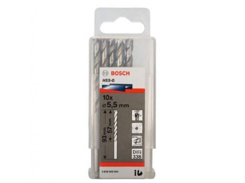 Spiralna burgija od brzoreznog čelika velike snage po normi DIN 338. Spiralna burgija sa desnim sečenjem tip N, vrh burgije 135°, ukršteno brušenje po normi DIN 1412 C, tolerancija prečnika h 8. Prihvat odgovara prečniku burgije, boja burgije: polirana. Sa dve oštrice, cilindrične, dve spirale. Napomena: Kod rada sa burgijama za metal HSS-G koristite univerzalno rezno ulje 2 607 001 409. Za legirani i nelegirani čelik do zetezne čvrstoće od 900 N/mm², čelični liv, sivi liv, sinterovano gvožđe, temper liv, obojene metale, tvrdu plastiku.