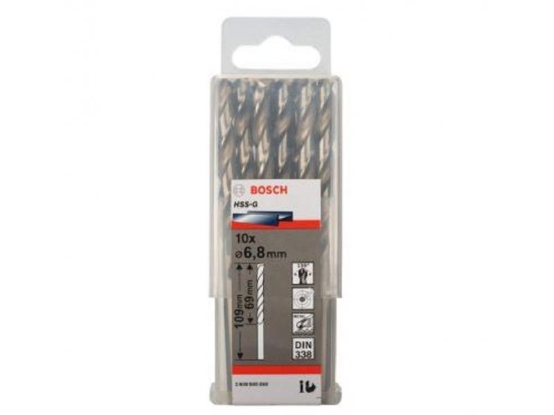 Spiralna burgija od brzoreznog čelika velike snage po normi DIN 338. Spiralna burgija sa desnim sečenjem tip N, vrh burgije 135°, ukršteno brušenje po normi DIN 1412 C, tolerancija prečnika h 8. Prihvat odgovara prečniku burgije, boja burgije: polirana. Sa dve oštrice, cilindrične, dve spirale. Napomena: Kod rada sa burgijama za metal HSS-G koristite univerzalno rezno ulje 2 607 001 409. Za legirani i nelegirani čelik do zetezne čvrstoće od 900 N/mm², čelični liv, sivi liv, sinterovano gvožđe, temper liv, obojene metale, tvrdu plastiku.
