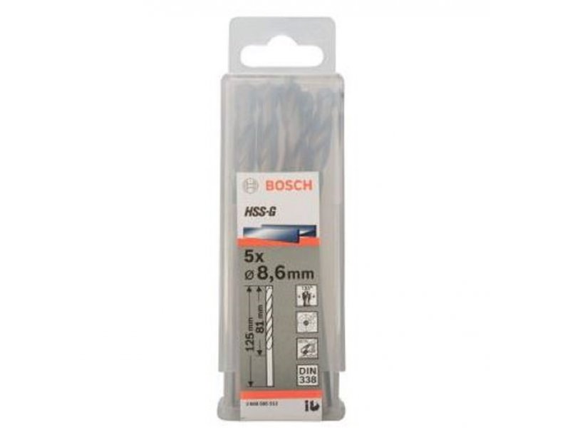 Spiralna burgija od brzoreznog čelika velike snage po normi DIN 338. Spiralna burgija sa desnim sečenjem tip N, vrh burgije 135°, ukršteno brušenje po normi DIN 1412 C, tolerancija prečnika h 8. Prihvat odgovara prečniku burgije, boja burgije: polirana. Sa dve oštrice, cilindrične, dve spirale. Napomena: Kod rada sa burgijama za metal HSS-G koristite univerzalno rezno ulje 2 607 001 409. Za legirani i nelegirani čelik do zetezne čvrstoće od 900 N/mm², čelični liv, sivi liv, sinterovano gvožđe, temper liv, obojene metale, tvrdu plastiku.