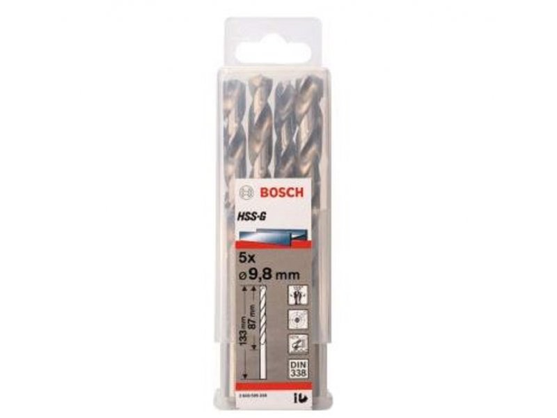 Spiralna burgija od brzoreznog čelika velike snage po normi DIN 338. Spiralna burgija sa desnim sečenjem tip N, vrh burgije 135°, ukršteno brušenje po normi DIN 1412 C, tolerancija prečnika h 8. Prihvat odgovara prečniku burgije, boja burgije: polirana. Sa dve oštrice, cilindrične, dve spirale. Napomena: Kod rada sa burgijama za metal HSS-G koristite univerzalno rezno ulje 2 607 001 409. Za legirani i nelegirani čelik do zetezne čvrstoće od 900 N/mm², čelični liv, sivi liv, sinterovano gvožđe, temper liv, obojene metale, tvrdu plastiku.