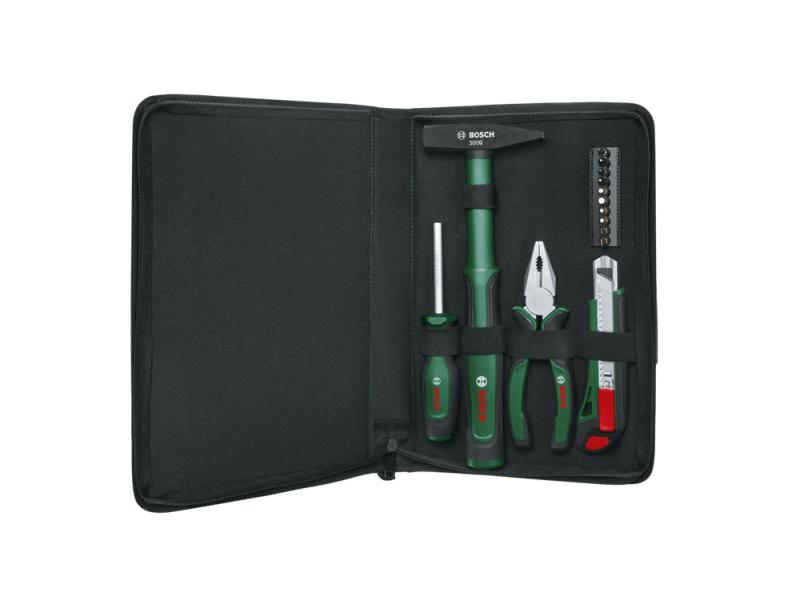 Bosch 14-delni set ručnog alata za početnike sadrži sve alate neophodne za hobi popravke i održavanje, montažu nameštaja ili osnovne građevinske radove. Praktično upakovan u prenosivu tekstilnu vreću sa patent zatvaračem, set sadrži kombinovana klešta, inženjerski čekić od 300 g, skalpel i univerzalni odvrtač, kao i 10 bitova. Svaki proizvod je izrađen robusno od kvalitetnih materijala i ergonomski dizajniran za dug radni vek, kao i optimalnu udobnost i kontrolu.