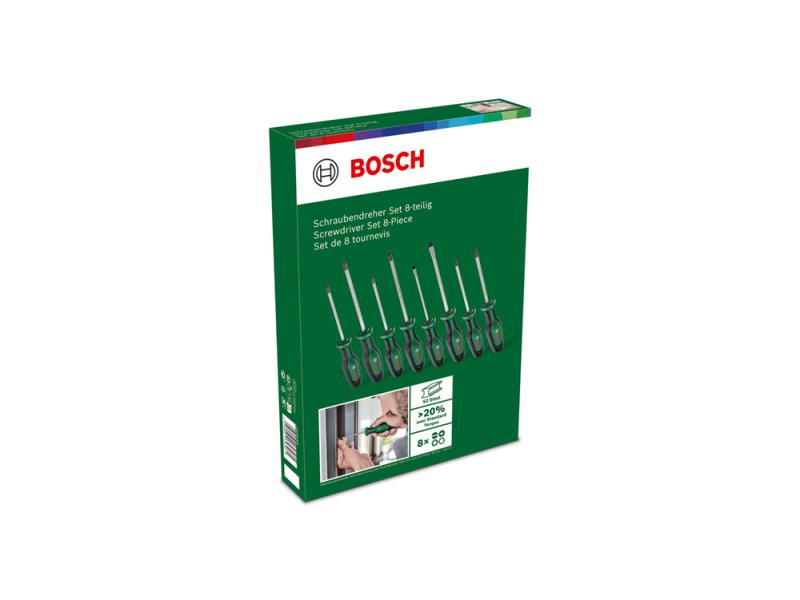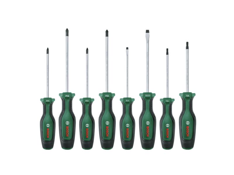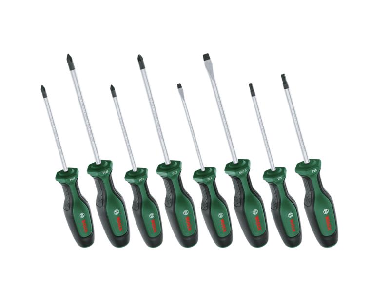 Brzo i efikasno obavljanje poslova pričvršćivanja pomoću odvrtača visokog kvaliteta iz Bosch seta odvrtača. Ovi odvrtači su kreirani sa idejom o vrhunskim performansama i superiornom udobnošću: svaki je napravljen od tvrdog S2 čelika koji je najbolji u klasi, obezbeđuje robustan obrtni moment barem 20% preko DIN standarda i ergonomski je dizajniran za optimalnu silu. Za stabilno uvrtanje šrafova i bolji vizuelni kontrast, vrhovi odvrtača u magnetni i obojeni crnim fosfatom. Dvokomponentna drška poseduje meki rukohvat za bolje rukovanje i udobnost, a kada je odložen, šestougaoni oblik odvrtača sprečava da se otkotrlja. Koji odvrtač za koji posao? To je lako uz oznake u boji za veličinu i oblik na drškama alata za brže biranje.