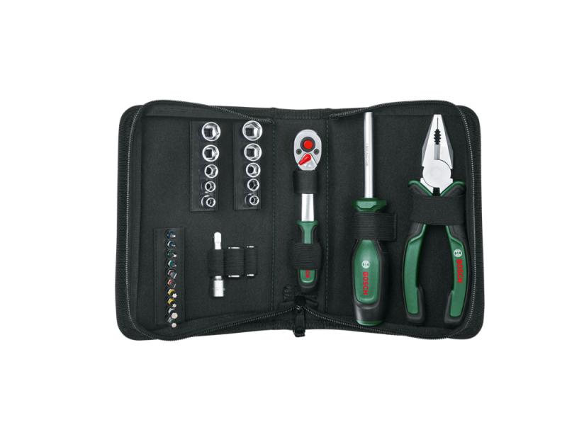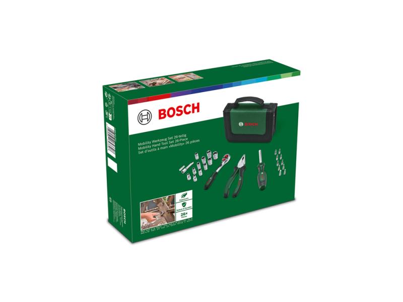 Višenamenski Bosch 26-delni set prenosnog ručnog alata je idealan za razne zadatke za sopstvenu izradu kod kuće i u pokretu. Set čine ¼-inčna čegrtaljka, univerzalni odvrtač, kombinovana klešta, adapteri sa 2 bita, 10 naglavaka, 10 bitova i produžna letva od 50mm, svi praktično uskladišteni u praktičnoj tekstilnoj futroli sa patent zatvaračem. Snažna čegrtaljka postiže impresivno veliki obrtni moment od 74–93 Nm ili 20–50% preko DIN standarda i može da radi pod uglom od 5° zahvaljujući zupčaniku sa 72 zubaca. Ovi alati su napravljeni od materijala vrhunskog kvaliteta i dizajnirani su sa superiornom ergonomijom kako bi obezbedili dug radni vek i vrhunsku udobnost.