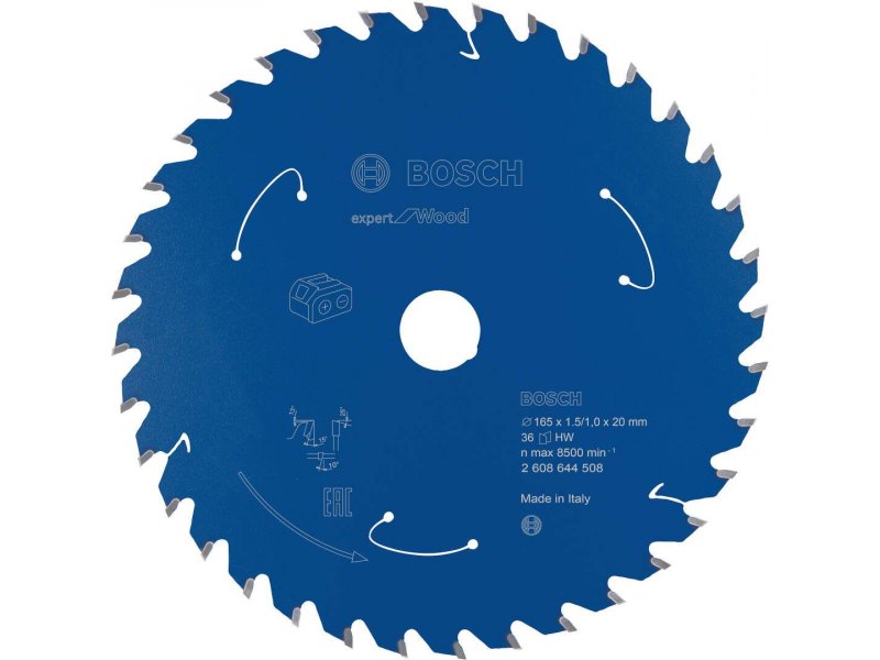 | Karakteristike | Tehnički podaci Spoljni prečnik mm: 165 Otvor mm: 20 Širina sečenja (b1) mm / debljina osnovnog lista (b2) mm: 1,5/1,0 Broj zubaca: 36 Oblik zubaca: ATB Maks. broj obrtaja (o/min): 8500 Rezultat sečenja: 3 Rezni ugao ° w1: 15 Leđni ugao ° w2: 13 |