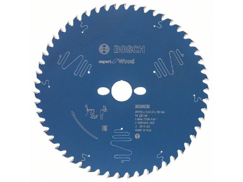 | Karakteristike | Tehničke karakteristike: Spoljni prečnik mm: 254 Otvor mm: 30 Širina sečenja (b1) mm / debljina osnovnog lista (b2) mm: 2.6/1.8 Broj zubaca: 54 Oblik zubaca: ATB Maks. broj obrtaja (o/min): 7500 Rezultat sečenja: 4 NL/prečnik TKS: 2/7/42 NL/prečnik TKS: 2/9,5/46,5 NL/prečnik TKS: 2/9/46 NL/prečnik TKS: 2/10/60 Rezni ugao ° w1: 10 Leđni ugao ° w2: 15 |