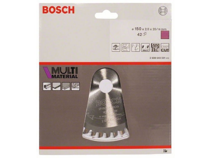 | Karakteristike | Bosch 2608640501 osobine: 150 x 20/16 x 2,0 mm; 42 Tehničke karakteristike: Spoljni prečnik mm: 150 Otvor mm: 20 Otvor sa redukcionim prstenom mm: 16 Širina sečenja (b1) mm / debljina osnovnog lista (b2) mm: 2.0/1.4 Broj zubaca: 42 Oblik zubaca: HLTCG Maks. broj obrtaja (o/min): 10000 Rezultat sečenja: 4 Pogodno za: Drvo | ploča od iverice Drvo | akustične ploče Drvo | ploče za laganu konstrukciju Drvo | MDF ploča obložena Plastika | epoksi (epoksidna smola) Metal koji ne sadrži gvožđe | aluminijum Metal koji ne sadrži gvožđe | legure Metal koji ne sadrži gvožđe | bakar |