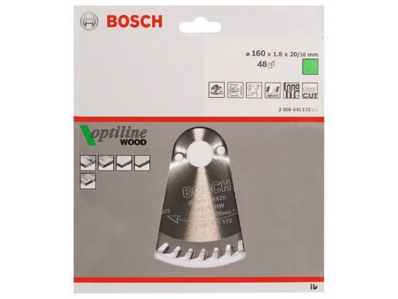 | Karakteristike | Bosch 2608641172 osobine: 160 x 20/16 x 1,8 mm, 48 Tehničke karakteristike: Spoljni prečnik mm: 160 Otvor mm: 20 Otvor sa redukcionim prstenom mm: 16 Širina sečenja (b1) mm / debljina osnovnog lista (b2) mm: 1.8/1.2 Broj zubaca: 48 Oblik zubaca: ATB Maks. broj obrtaja (o/min): 9500 Rezultat sečenja: 4 NL/prečnik TKS: 6/32 Pogodno za: Drvo | ploča od iverice Drvo | akustične ploče Drvo | ploče za laganu konstrukciju Drvo | kompozitni materijali Drvo | meko drvo Drvo | tvrdo drvo/masivno drvo Drvo | presovano slojevito drvo Drvo | šperploča/stolarska ploča Drvo | MDF ploča obložena |