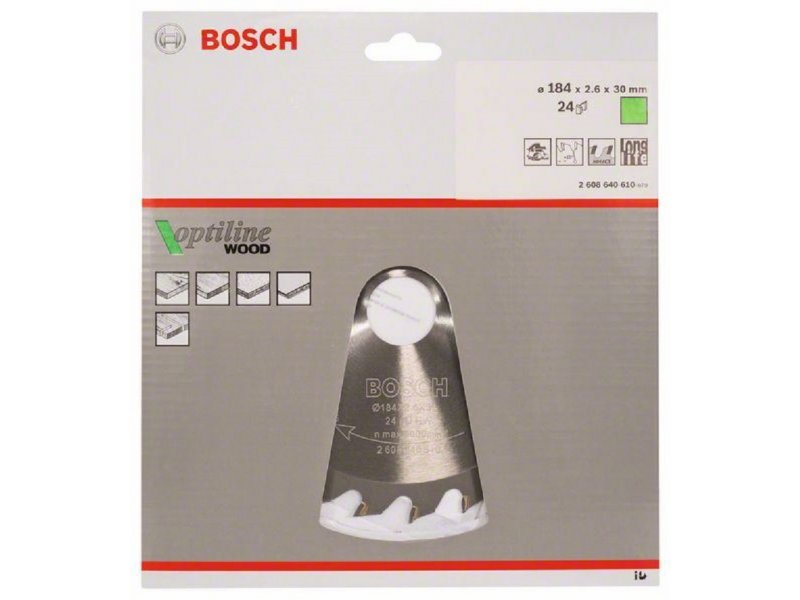 | Karakteristike | Bosch 2608640610 osobine: 184 x 30 x 2,6 mm, 24 Tehničke karakteristike: Spoljni prečnik mm: 184 Otvor mm: 30 Širina sečenja (b1) mm / debljina osnovnog lista (b2) mm: 2.6/1.6 Broj zubaca: 24 Oblik zubaca: ATB Maks. broj obrtaja (o/min): 8000 Rezultat sečenja: 2 Pogodno za: Drvo | ploča od iverice Drvo | akustične ploče Drvo | ploče za laganu konstrukciju Drvo | kompozitni materijali Drvo | meko drvo Drvo | tvrdo drvo/masivno drvo Drvo | presovano slojevito drvo Drvo | šperploča/stolarska ploča Drvo | MDF ploča obložena |