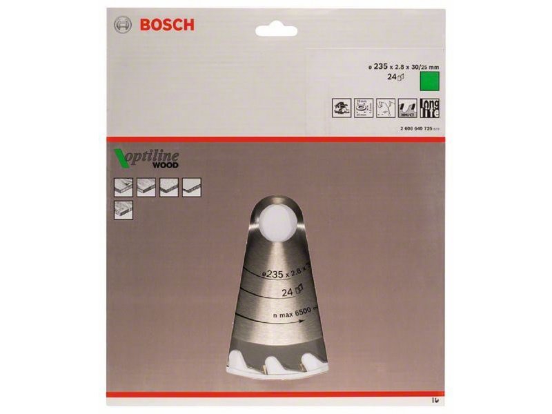 | Karakteristike | Bosch 2608640725 osobine: 235 x 30/25 x 2,8 mm, 24 Tehničke karakteristike: Spoljni prečnik mm: 235 Otvor mm: 30 Otvor sa redukcionim prstenom mm: 25 Širina sečenja (b1) mm / debljina osnovnog lista (b2) mm: 2.8/1.8 Broj zubaca: 24 Oblik zubaca: ATB Maks. broj obrtaja (o/min): 6500 Rezultat sečenja: 2 Pogodno za: Drvo | ploča od iverice Drvo | akustične ploče Drvo | ploče za laganu konstrukciju Drvo | kompozitni materijali Drvo | meko drvo Drvo | tvrdo drvo/masivno drvo Drvo | presovano slojevito drvo Drvo | šperploča/stolarska ploča Drvo | MDF ploča obložena |