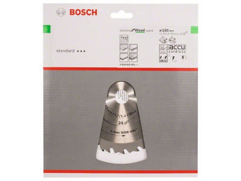 | Karakteristike | Bosch 2608642601 osobine: 165 x 20/16 x 1,7 mm, 24 Tehničke karakteristike: Spoljni prečnik mm: 165 Otvor mm: 20 Otvor sa redukcionim prstenom mm: 16 Širina sečenja (b1) mm / debljina osnovnog lista (b2) mm: 1.7/1.2 Broj zubaca: 24 Oblik zubaca: FT-ATB (HF) Maks. broj obrtaja (o/min): 9000 Rezultat sečenja: 2 Pogodno za: Drvo | daske oplate Drvo | ploča od iverice Drvo | akustične ploče Drvo | ploče za laganu konstrukciju Drvo | meko drvo Drvo | tvrdo drvo/masivno drvo |