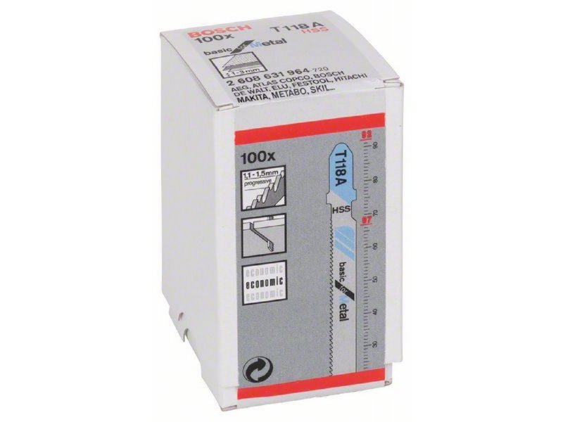 | Karakteristike | Bosch 2608631964 osobine: T 118 A HSS, talasasta, glodana Tanki limovi (1-3 mm) Basic for Metal Tehničke karakteristike: Limovi [mm]: 1-3 Materijal: HSS Izvedba zubaca: talasasto izglodan Ukupna dužina [mm]: 92 Korak zubaca [mm]: 1,1-1,5 Područja primene: tanki limovi (1-3 mm) Tip: T 118 A Pogodno za: Metali koji sadrže gvožđe | limovi |