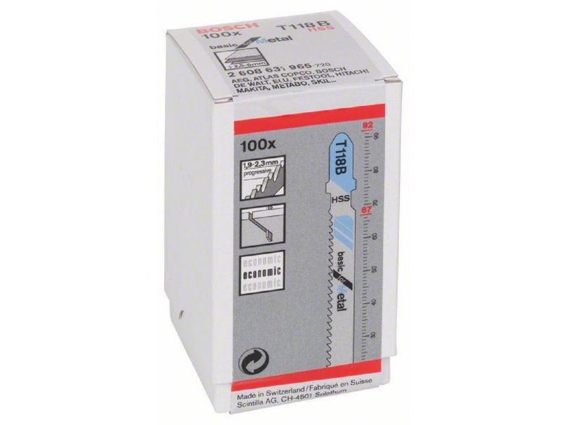 | Karakteristike | Bosch 2608631965 osobine: T 118 B HSS, talasasta, glodana Limovi srednje debljine (2,5-6 mm) Basic for Metal Tehničke karakteristike: Limovi [mm]: 2.5-6 Materijal: HSS Izvedba zubaca: talasasto izglodan Ukupna dužina [mm]: 92 Korak zubaca [mm]: 1,9-2,3 Područja primene: limovi srednje debljine (2,5-6 mm) Tip: T 118 B Pogodno za: Metali koji sadrže gvožđe | limovi |