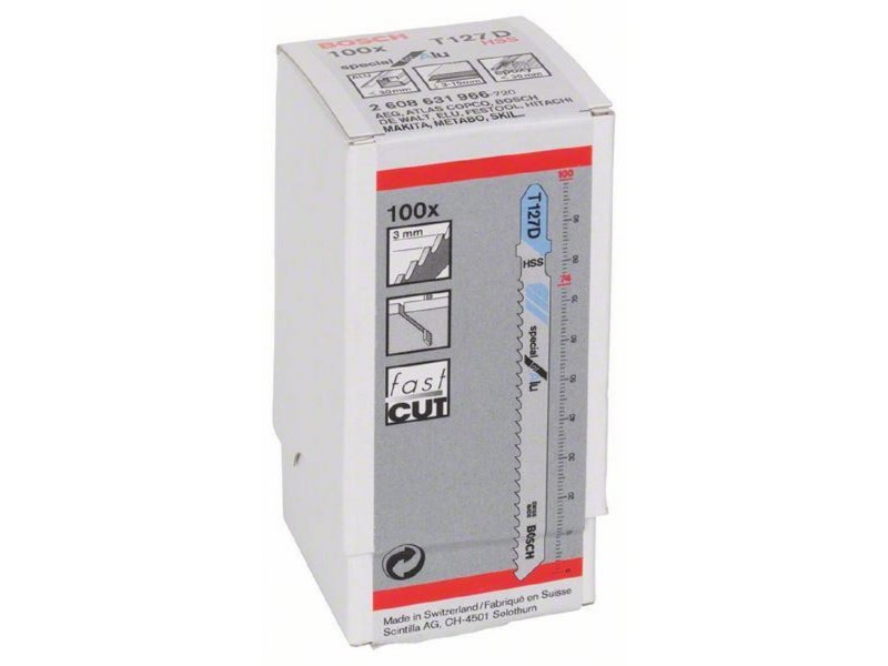 | Karakteristike | Bosch 2608631966 osobine: T 127 D HSS, ukrštena, glodana Tanki do debeli limovi (3-15 mm), cevi + profili (ø <30 mm) Special for Alu Tehničke karakteristike: Limovi [mm]: 3-15 Aluminijum [mm]: <30 Plastika ojačana staklenim vlaknima / epoxy [mm]: <30 Materijal: HSS Izvedba zubaca: ukršteno izglodan Ukupna dužina [mm]: 100 Korak zubaca [mm]: 3,0 Područja primene: tanki do debeli limovi (3-15 mm), cevi + profili (Ø <30 mm) Tip: T 127 D Pogodno za: Metali koji sadrže gvožđe | limovi Plastika | epoksi (epoksidna smola) Plastika | plastika pojačana staklenim vlaknima (GRP) |