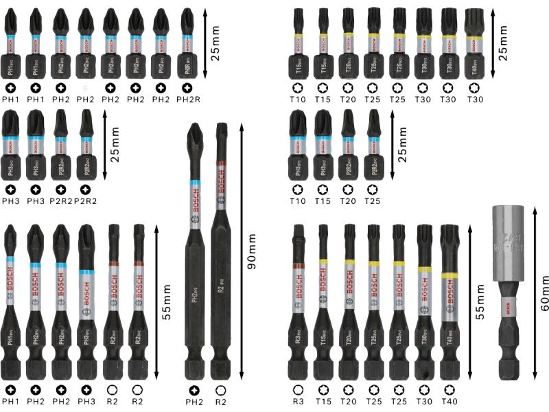 Nastavak za odvrtače od 25 mm: PH1(2x); PH2(5x); PH2R; PH3(2x); T15(2x); T20; T25(2x); T30(2x); T40(2x); R1(2); R2(3); R3(2)