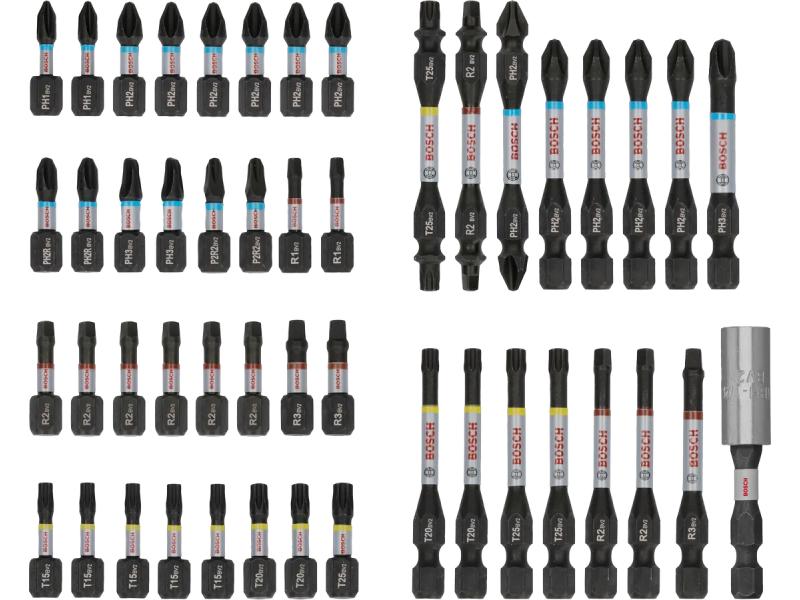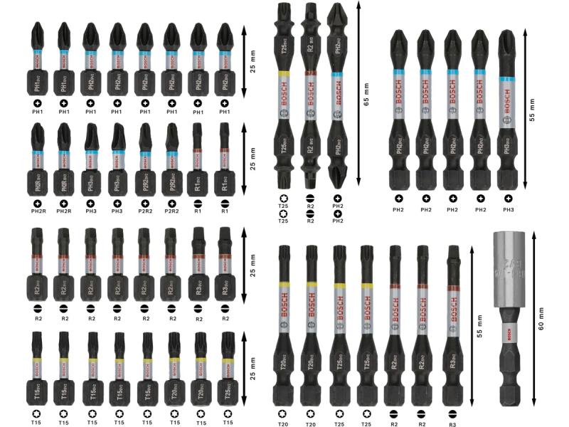 | Karakteristike | Snažno odvrtanje Proširena torziona zona apsorbuje naprezanje zbog obrtnog momenta na vrhu nastavka za odvrtače Kaljeni modifikovani čelik osigurava da su nastavci za odvrtače jaki i otporni na veliki obrtni momenat Nastavak za odvrtače od 25 mm: PH1(2x); PH2(6x); PH2R(2x); PH3(2x); T15(5x); T20(2x); T25; R1(2x); R2(6x); R3(2x); P2R2(2x) Nastavak za odvrtače od 55 mm: PH2(4x); PH3; T20(2x); T25(2x); R2(2x); R3 Nastavak za odvrtače od 65 mm: PH2/PH2; T25/T25; R2/R2 Držač za nastavke od 60 mm: Standardni držač nastavaka |