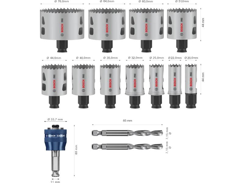 | Karakteristike | Prečnik: 20 mm; 22 mm; 25 mm; 32 mm; 35 mm; 40 mm; 44 mm; 51 mm; 60 mm; 64 mm; 76 mm Radna dužina: 44 mm Pogodno za: Meko drvo, Gips, Plastiku, Metalne cevi i profile, Obojene metale |