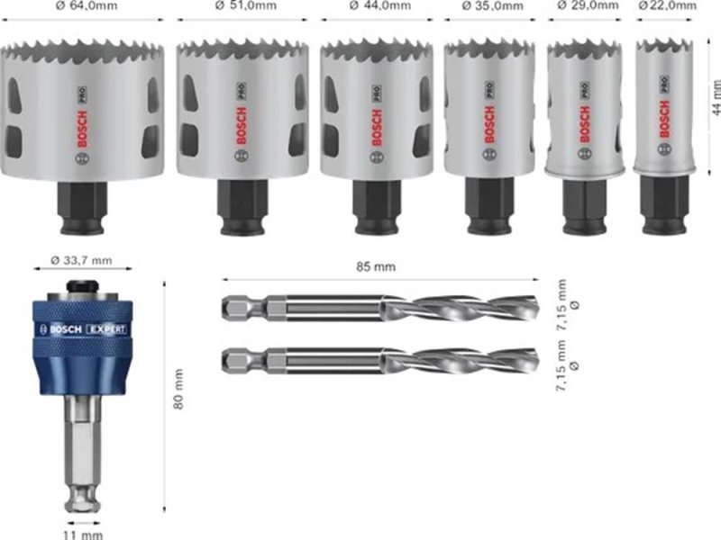 | Karakteristike | Prečnik: 22 mm; 29 mm; 35 mm; 44 mm; 51 mm; 64 mm Radna dužina: 44 mm Pogodno za: Meko drvo, Gips, Plastiku, Metalne cevi i profile, Obojene metale |