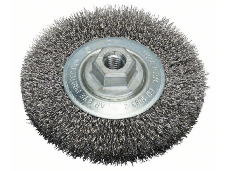| Karakteristike | Bosch 2608622100 osobine: Pločasta četka – talasasta žica Optimalno prikladna za uklanjanje boje kod popuštanja na varovima. Prikladna za lake do srednje radove čišćenja pri velikim perifernim brzinama na manjim metalnim površinama, u brazdama ili na ivicama, na primer za uklanjanje rđe, nahrapavljenje, matiranje, skidanje laka. Za sve ugaone brusilice sa navojem M 14 i za GGS 6 S Professional 115 mm, 0,3 mm, M14 Tehničke karakteristike: Prečnik mm: 115 Debljina žice mm: 0,30 Broj obrtaja, maks. min-1: 11.000 Navoj M: 14 Pogodno za: Metali koji sadrže gvožđe | čelik/metal koji sadrži gvožđe Obložna tkanina | boja |