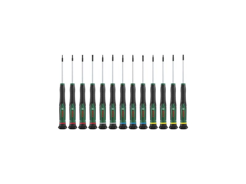 Brzo i efikasno popravljanje malih elektronskih uređaja, naočara, laptopova ili satova pomoću Bosch Precision seta odvrtača visokog kvaliteta. Sadrži 13 preciznih odvrtača (SL1.5, SL2.0, SL2.5, SL3.0, PH000, PH00, PH0, TX5, TX6, TX8, TX9, HEX1.5, HEX2.0) koji su kreirani sa idejom o vrhunskim performansama i superiornom udobnošću: svaki je napravljen od tvrdog S2 čelika koji je najbolji u klasi, obezbeđuje robustan obrtni moment od najmanje 40% preko ISO standarda. Njihov tanak, ergonomski dizajn sa drškom sa mekim rukohvatom i rotirajućom kapicom za bolje rukovanje i udobnost omogućavaju lako i brzo okretanje, dok obezbeđuje optimalnu silu za kontrolisano precizno uvrtanje šrafova. Za stabilno uvrtanje šrafova i bolji vizuelni kontrast, vrhovi odvrtača u magnetni i obojeni crnim fosfatom. Kada je odložen, šestougaone ivice drške odvrtača sprečavaju ga da se otkotrlja. Koji odvrtač za koji posao? To je lako uz oznake u boji za veličinu i oblik na dršci i poleđini alata za brže biranje. Svi odvrtači su prikladno smešteni u praktičnoj tekstilnoj torbi sa rajsferšlusom.