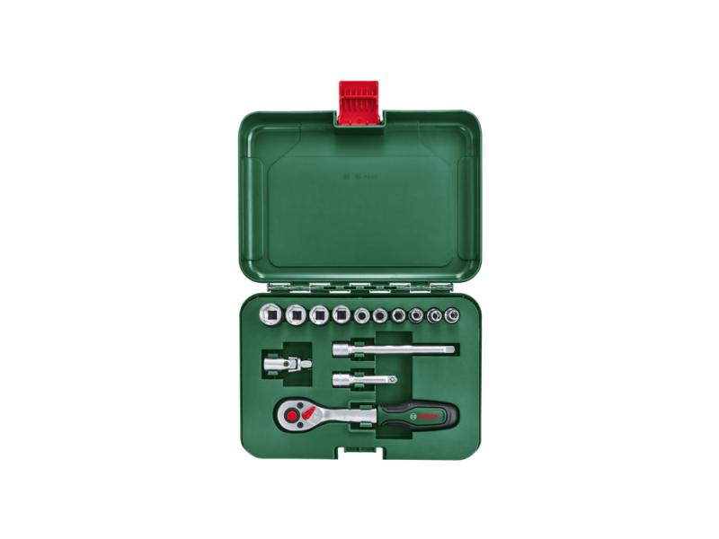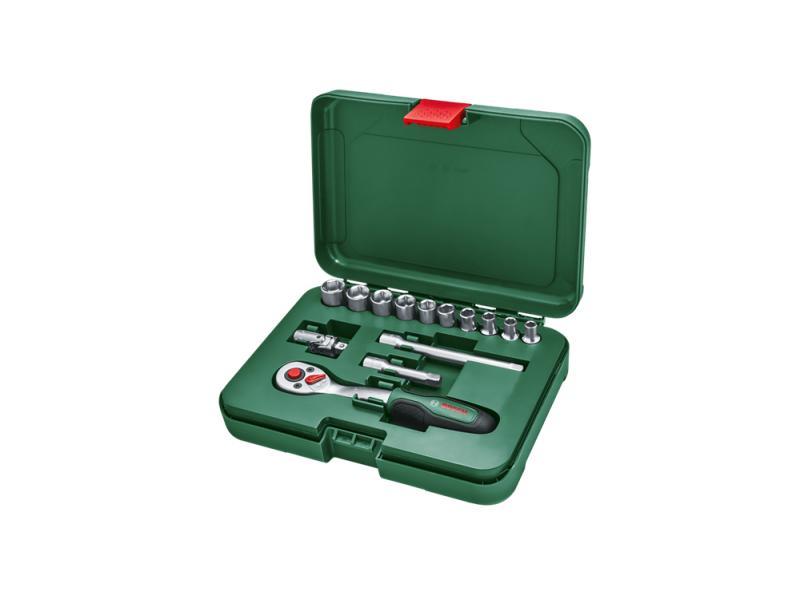 Bosch ¼-inčni 14-delni set adaptera za nasadni ključ visokog kvaliteta je praktičan pomoćnik za hobi mehaničare i zadatke sklapanja. Set čine ¼-inčna čegrtaljka, adapter, 10 naglavaka i 2 produžne letve, svi smešteni u praktičan kofer za odlaganje. Čegrtaljka pruža impresivno veliki obrtni moment od 74–93 Nm ili 20–50% preko DIN standarda i može da radi pod uglom od 5° zahvaljujući zupčaniku sa 72 zupca. Za dosezanje nepristupačnih mesta, udobnost i kontrolu, čegrtaljka ima zakrivljenu, ergonomsku dršku sa mekim rukohvatom.