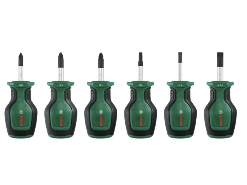 Ovaj komplet Bosch kratkog odvrtača obezbeđuje udobno i praktično rešenje za brzo i efikasno sklapanje nameštaja, popravke i mnoge druge primene u kućnoj izradi u skučenim prostorima. Čini ga 6 kratkih odvrtača (PH1, PH2, PZ2, TX20, SL4, SL6.5). Ergonomski dizajnirana, dvokomponentna drška sa mekim rukohvatom i kompaktnom osovinom veličine 29 mm, obezbeđuje optimalnu udobnost i kontrolu, čak i na teško dostupnim mestima. Svaki kratki odvrtač je napravljen od izuzetno tvrdog S2 čelika i obezbeđuje impresivno veliki obrtni moment barem 40% veći od ISO standarda (prema standardima: ISO2380, ISO8764, TMD-705). Magnetni vrh sa crnim fosfatom poboljšava vizuelni kontrast i rukovanje šrafovima. Kada je odložen, šestougaoni oblik drške odvrtača sprečava ga da se otkotrlja. Koji odvrtač za koji posao? To je lako uz oznake u boji za veličinu i oblik na drškama alata za brže biranje.