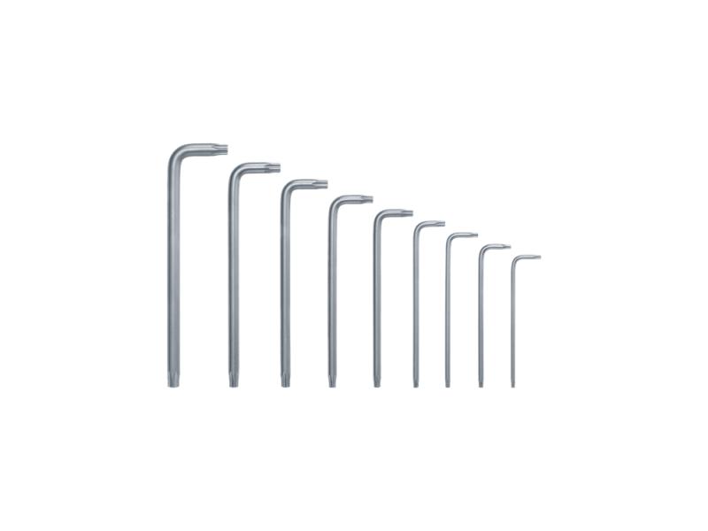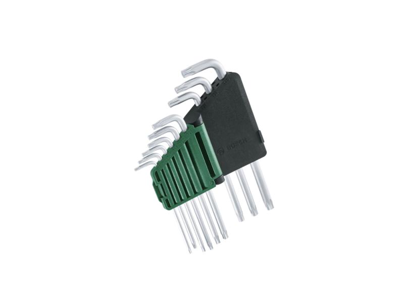 Bosch komplet Torx ključeva donosi novi nivo fleksibilnosti i praktičnosti za kućne mehaničarske poslove i samostalno montiranje. Komplet uključuje sve najčešće korišćene veličine za kućne i hobi primene: TX8, TX9, TX10, TX15, TX20, TX25, TX27, TX30, TX40. Svaki ključ u ovom praktičnom setu je napravljen od izuzetno tvrdog S2 čelika i poseduje premaz od nikla sa satenskom završnom obradom. To obezbeđuje vrhunsku zaštitu od rđe i dug radni vek. Ključevi sa dugačkom polugom obezbeđuju 20% veći obrtni moment u odnosu na standardni i optimalni su za rad u skučenom prostoru. 9 Torx ključeva se praktično čuvaju zajedno u okviru za skladištenje koji se zaključava klikom, sa nekoliko ugaonih graničnika za lako izvlačenje ključeva.