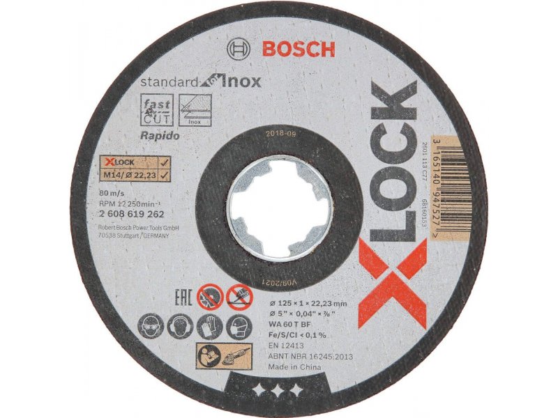 Menjanje reznih ploča je brzo i lako zahvaljujući sistemu bez ključa X-LOCK. X-LOCK rezne ploče odgovaraju i standardnim ugaonim brusilicama. Rezne ploče za INOX sa dobrim učinkom po privlačnoj ceni Maksimalna periferna brzina: 80 m/s (u zavisnosti od broja obrtaja u minuti i prečnika ploče) Fe/S/Cl < 0,1%