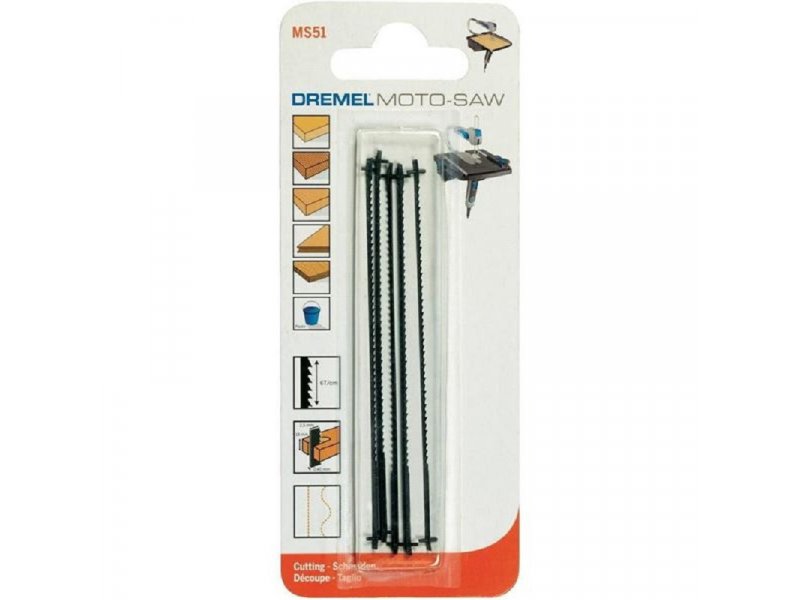 | Karakteristike | Dremel MS51 tehničke karakteristike: DREMEL® Moto-Saw Sečivo testere za sečenje drveta opšte namene Sečivo testere za pravo sečenje i zakrivljeno sečenje velikog prečnika u drvenim i plastičnim materijalima Ovo sečivo ima 6 zubaca po santimetru, što omogućava dobar balans između brzine i preciznosti Ukupna dužina 100 mm Dubina sečenja 18 mm Zubaca po centimetru 6 Debljina sečiva 0,4 mm Dubina sečiva 2,5 mm. Obim isporuke: 5 komada |
