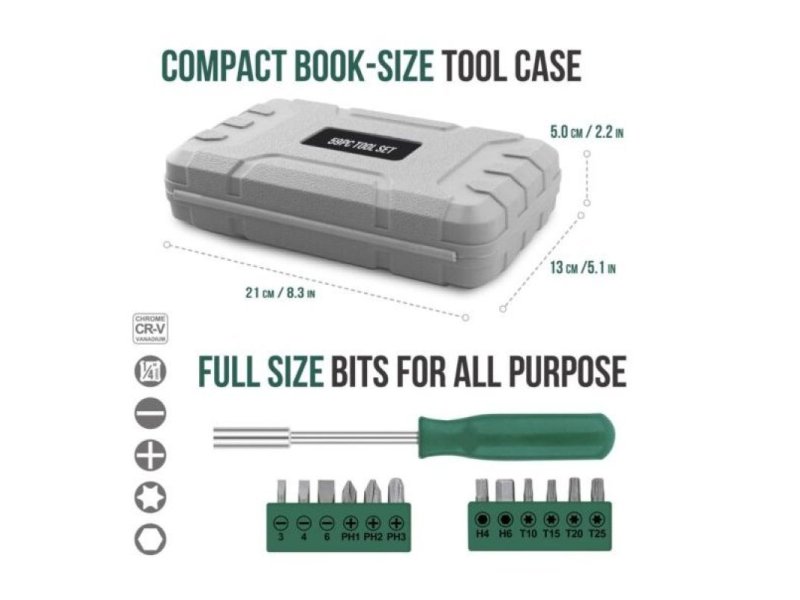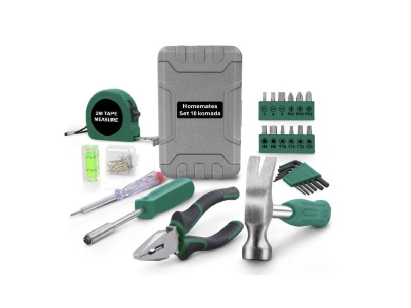 | Karakteristike | Sadržaj kompleta: Mini čekić – lagan i precizan za sitne popravke Kombinovana klešta – za hvatanje, uvrtanje i sečenje žica 2 šrafcigera (ravni i krstasti) Set imbus ključeva (6 komada – H1.5–5) Metar od 2 metra sa automatskim uvlačenjem Tester napona i izolir traka Prednosti: Kompaktan i lako prenosiv dizajn Osnovni alati za najčešće kućne i DIY poslove Ergonomske drške i čvrsta izrada Praktično rešenje za dom, kancelariju ili automobil Odličan poklon za svakog majstora i početnika Pakovanje sadrži: 10 komada alata u praktičnoj kutiji sa držačima |