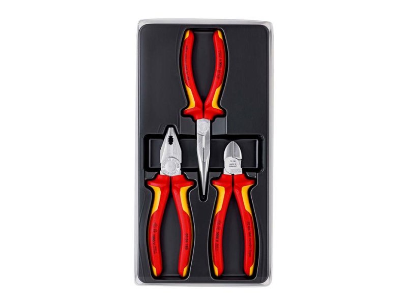 | Karakteristike | Set sadrži: 1 x Knipex izolovana kombinovana klešta 1000V VDE 180 mm (03 06 180) 1 x Knipex 1000V VDE izolovana špic prava klešta 200 mm (26 16 200) 1 x Knipex izolovane dijagonalne sečice 160 mm 1000V VDE (70 06 160) |