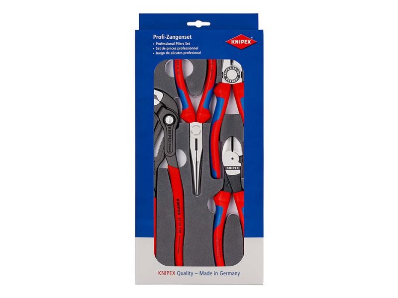 | Karakteristike | Set sadrži: 1 x Knipex klešta kombinovana 180 mm (03 02 180) 1 x Knipex špic klešta prava 200 mm (26 12 200) 1 x Knipex ojačane bočne sečice 180 mm (74 02 180) 1 x Knipex papagaj klešta Cobra® 250 mm (87 01 250) Materijal: Dvobojna kompaktna pena Dimenzije: 335 x 165 x 33 mm |