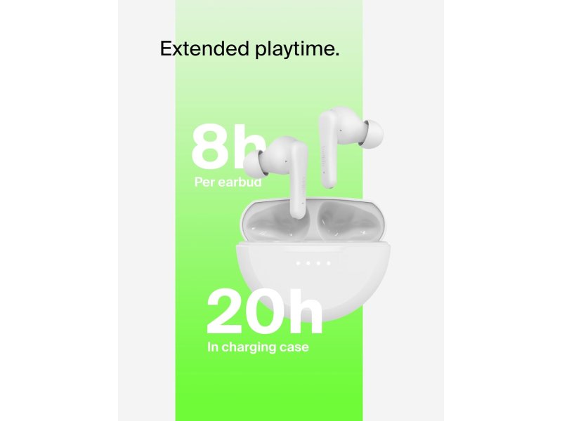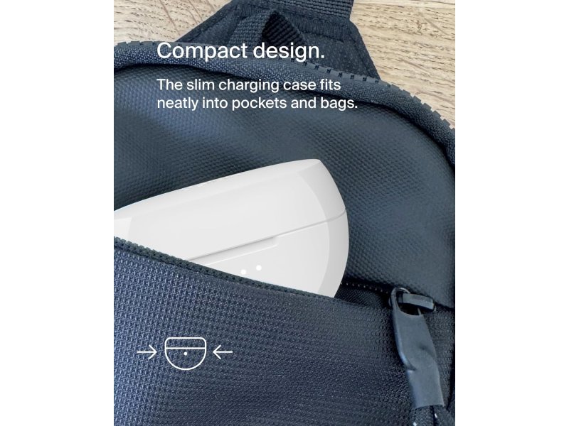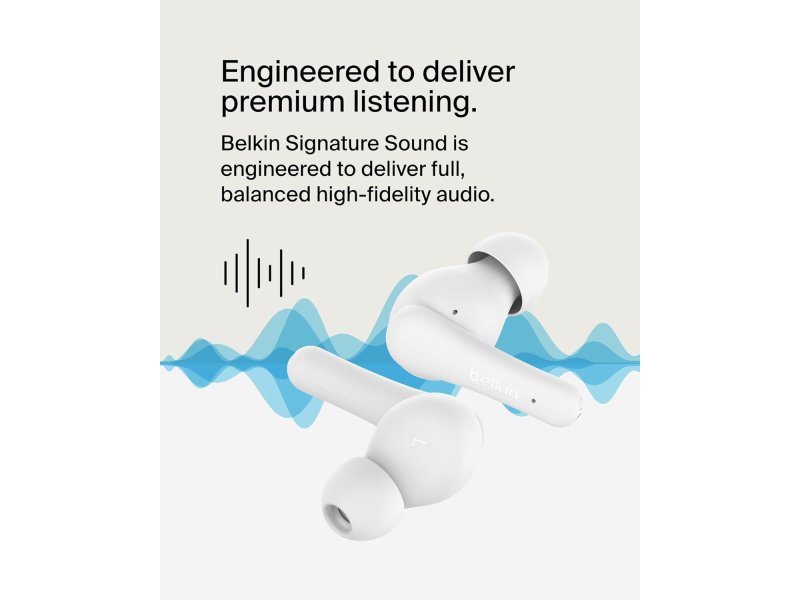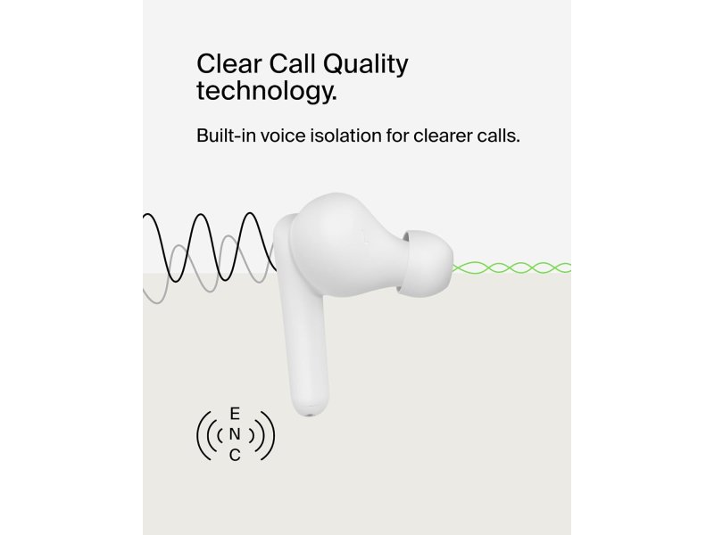 BELKIN POTPISAN ZVUK + JASAN KVALITET POZIVA: Ove bežične slušalice su dizajnirane da isporuče pun, uravnotežen hi‑fi zvuk, dok Environmental Noise Cancellation (ENC) eliminiše pozadinsku buku tako da ljudi mogu jasnije da te čuju.