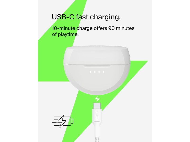 CIPELOVANJE TOKOM CELog DANA: 8 sati rada po slušalici plus još 20 sati u kućištu daje ukupno 28 sati baterije, što omogućava ovim slušalicama da prate tvoj ritam tokom celog dana — od škole do teretane i više! Samo 10 minuta USB‑C brzog punjenja daje 90 minuta reprodukcije.