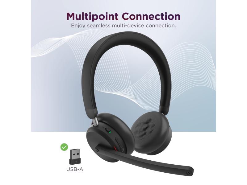 | Karakteristike | Bežično povezivanje preko Bluetooth 5.3 USB-A bežični dongle za stabilnu vezu sa računarom Dual mode konekcija Bluetooth i USB receiver Active Noise Cancelling ANC za slušalice Environmental Noise Cancelling ENC za mikrofon Microsoft Teams sertifikacija i Teams dugme Mikrofon na nosaču sa poništavanjem buke Dva uređaja istovremeno povezivanje multipoint Do oko 60 sati reprodukcije muzike ili do oko 30 sati razgovora Drajveri 40 mm Frekvencijski opseg 20 Hz do 20000 Hz Težina oko 165 grama USB C punjenje Dometa do oko 30 metara |